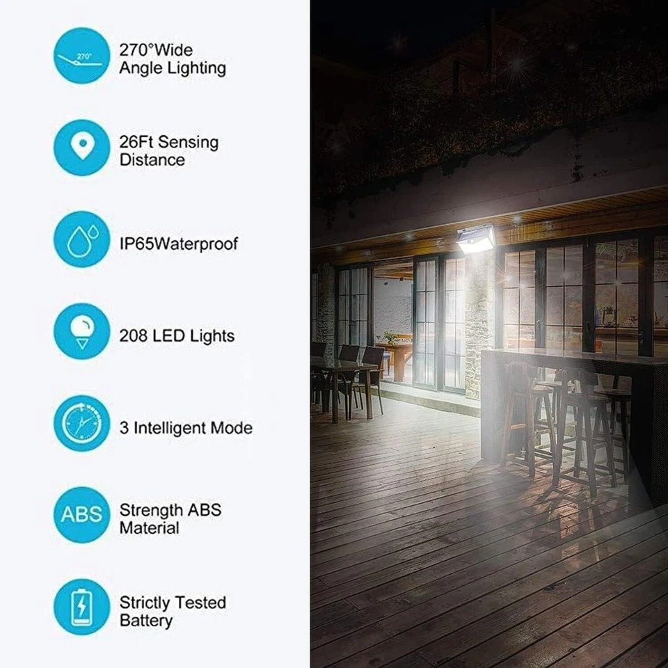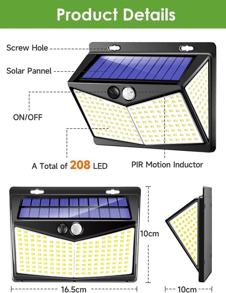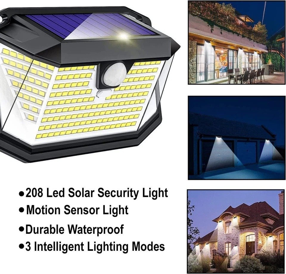 Upgrade your outdoor lighting with the 208 LED Solar Motion Sensor Security Light, designed to provide reliable, eco-friendly illumination for gardens, patios, pathways, and driveways. With three intelligent lighting modes, this solar light ensures safety, convenience, and energy efficiency every night.