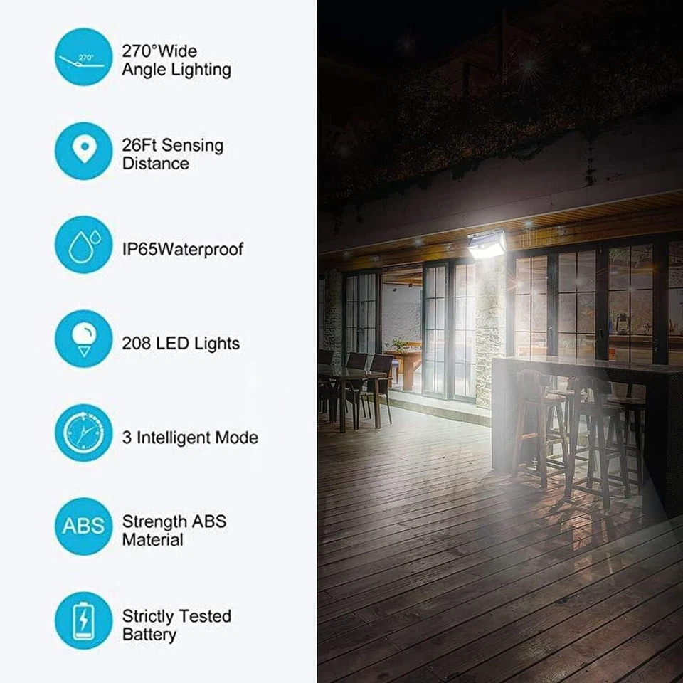 Powered by solar energy, this 208 LED outdoor wall light is easy to install, requires no wiring, and is ideal for enhancing security around your home. Its motion sensor technology, combined with waterproof durability, makes it suitable for year-round outdoor use.
