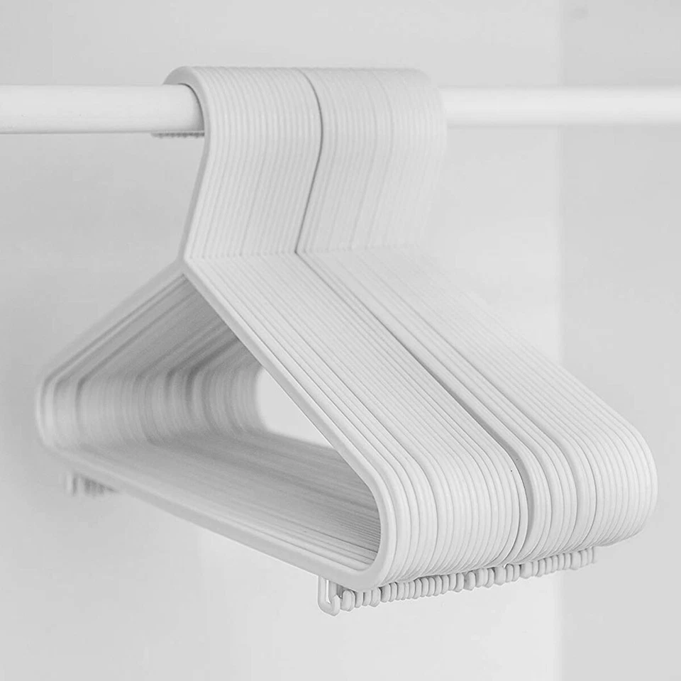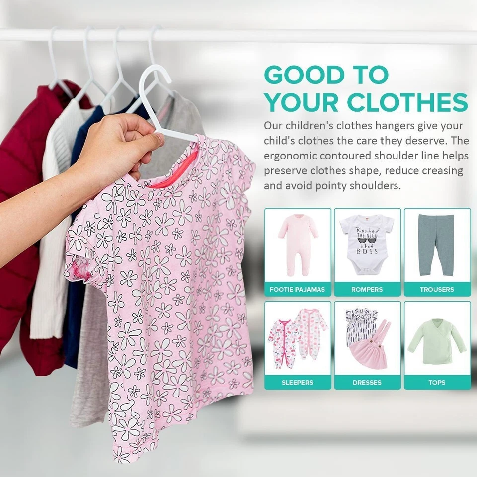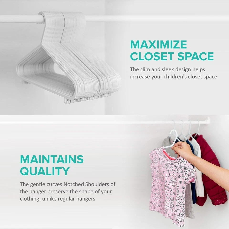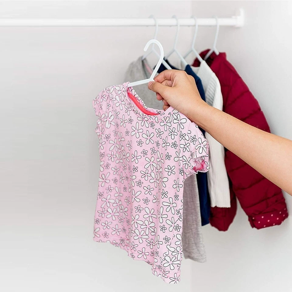 40-pack of Kids Plastic Hangers. Designed for both durability and practicality, these hangers are perfect for baby and toddler clothes, offering excellent support without taking up extra space.
