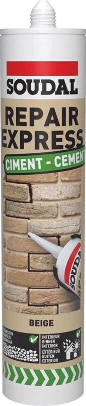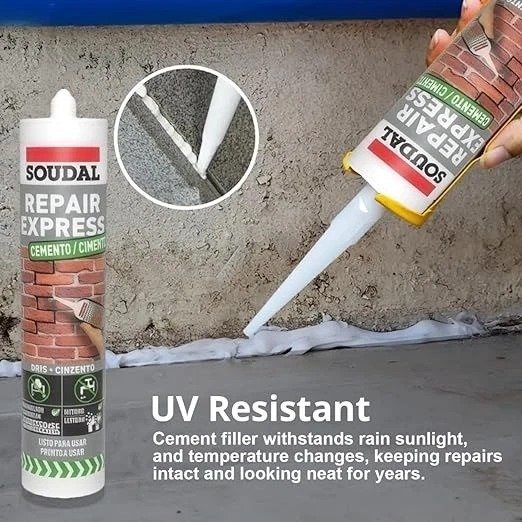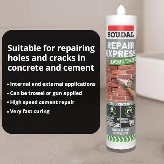The Soudal Repair Express Cement (Grey, 290ml) is a ready-to-use acrylic-based repair filler designed for quick, professional-quality repairs on brickwork, concrete, stone, and render. This premium mortar filler offers a realistic cement-grey finish, ideal for restoring cracks, gaps, and joints in visible masonry surfaces.