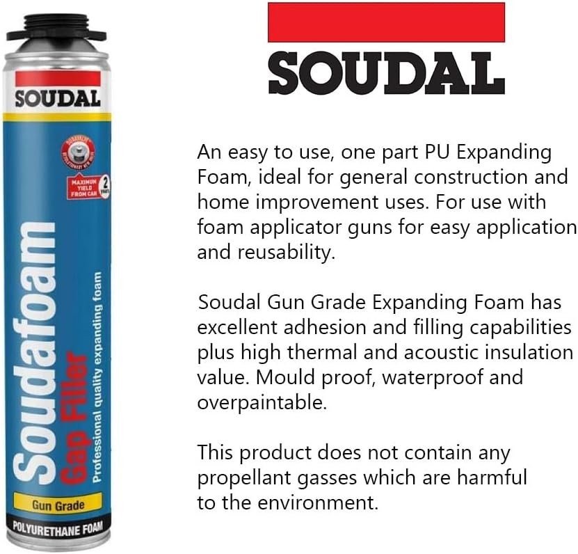 The Soudal Soudafoam Gap Filler (750ml, Gun Grade) is a high-performance expanding polyurethane foam designed for professional sealing, insulating, and filling applications. It provides excellent adhesion to most building materials, including concrete, brick, wood, metal, and plastics.